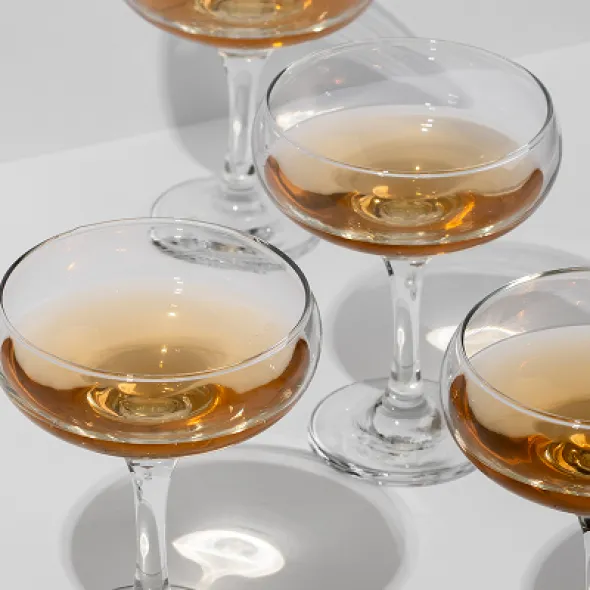 Стопка с янтарным напитком, украшенная долькой апельсина и сахарной каймой, на тёплом фоне
